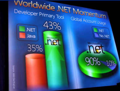 At the same time, he cited data (from Microsoft's WorldWide DevTracker surveys) showing that .NET is the primary developer tool for 43 percent of developers compared to only 35 percent using Java as their primary tool. And going a step further, Ballmer's research on enterprise development usage showed that only 10 percent of large companies aren't using .NET for any development.