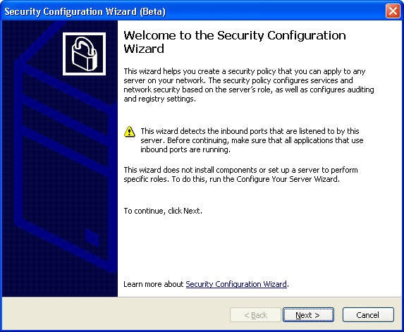 Figure 2. The Security Configuration Wizard With the application of Service Pack 1, Windows Server 2003 will now provide you with the Security Configuration Wizard, a new tool that helps you prepare deployable security configurations you can apply to the server roles found within your organization. | ||