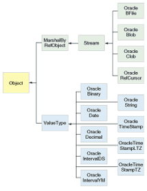 ADO.NET data providers implement provider-specific classes that implement common interfaces. Some of these classes extend base classes in the .NET Framework. The data-provider classes implemented in ODP.NET are part of the Oracle.DataAccess.Client namespace (see Table 1). A data provider must also map database data types to the .NET type system (see the sidebar, "Use ODP.NET to Help Map Data Types"). It can expose database-specific classes to map more closely if no .NET types are an exact fit. ODP.NET exposes a series of extended data types in the Oracle.DataAccess.Types namespace. Some of these are implemented as value types (structures, in C#), because .NET value types provide optimizations over making every type a class; others are implemented as reference types (classes) (see Figure 1).