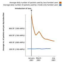 Selling data applications is the holy grail for resuscitating cellular industry profit margins. They, in turn, are driven by the mobile industry's key figure of merit: ARPU. Seppo Aaltonen, Nokia's Head of Technology and Architecture Marketing, points optimistically to NTT DoCoMo's use of Java in its world's-first 3G handsets. "Java applications [use was double] i-mode application use [400 packets compared to 200 packets] after only seven months of use," Aaltonen said (see Figure 1). As disappointing as WAP has been, Short Message System (SMS) e-mail is booming. There are one billion SMS messages sent daily, providing user fees of 100 million euros a day. "By 2006 we expect 35 percent of carrier revenue to come from data, providing 45 euros a month," Aaltonen said.